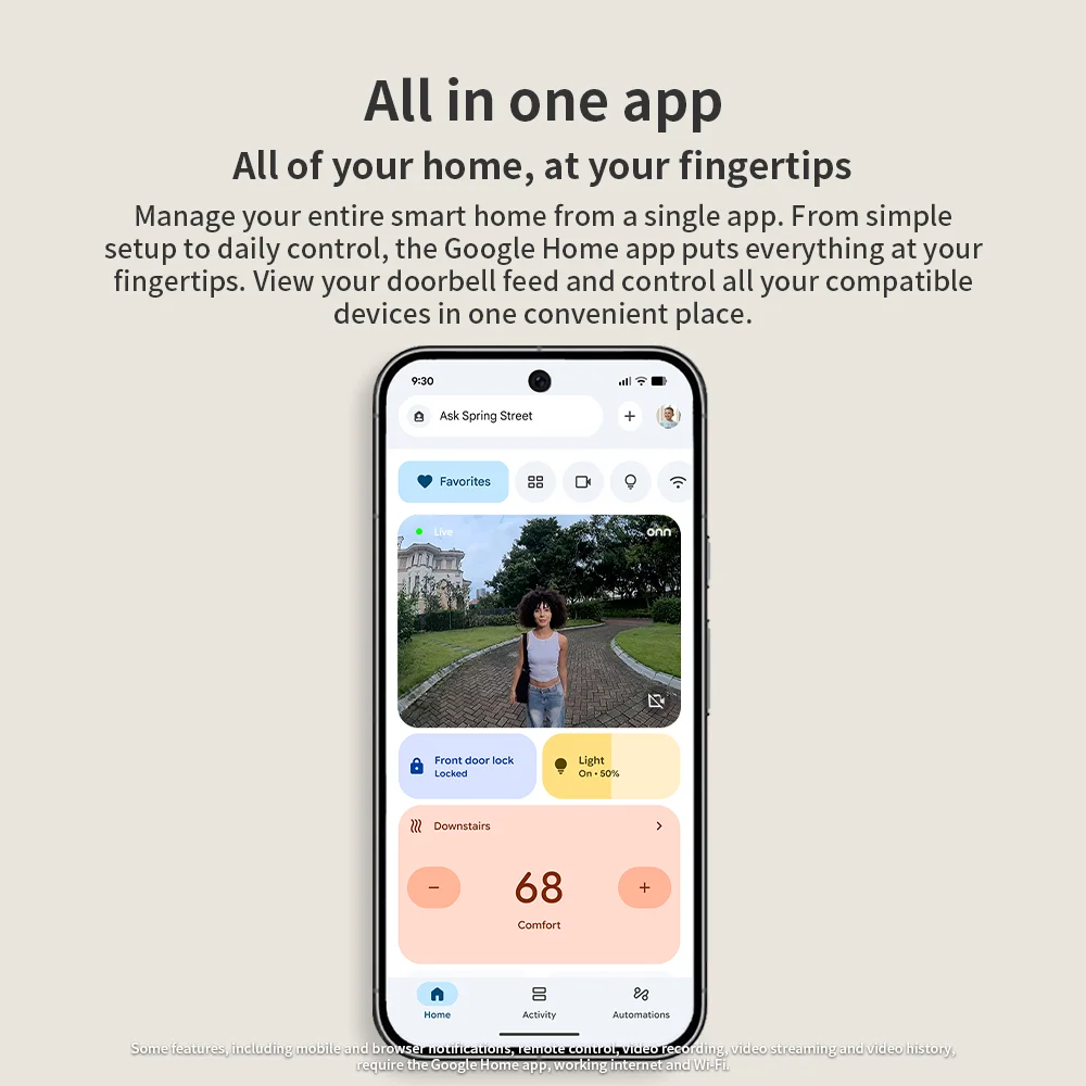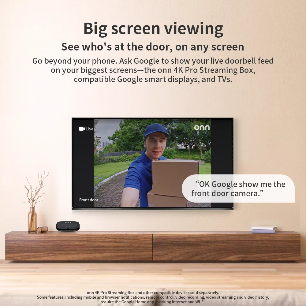 - Ecosystem Integration & Big Screen Viewing: Simple setup and control with the Google Home app to manage your entire smart home from one place. Go beyond your phone and see who’s at the door on your biggest screens. Live feed on your TV using the onn 4K Pro or other compatible smart displays. Use voice on TV.