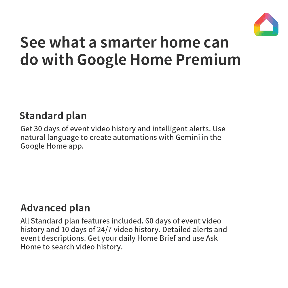 - The Google Home Premium Advanced plan includes all Standard plan features and unlocks the full power of Gemini for your doorbell.