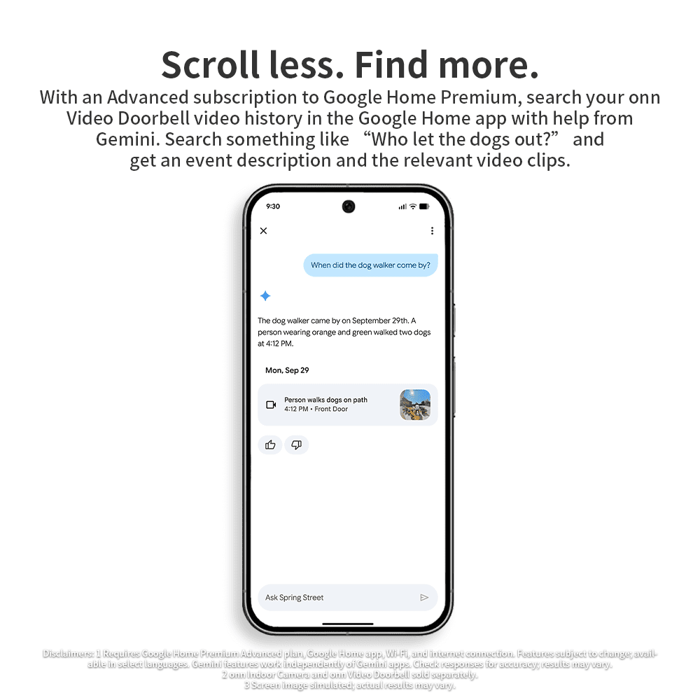 - Disclaimers: 1 Requires Google Home Premium Advanced plan, Google Home app, Wi-Fi, and internet connection. Features subject to change; available in select languages. Gemini features work independently of Gemini apps. Check responses for accuracy; results may vary.