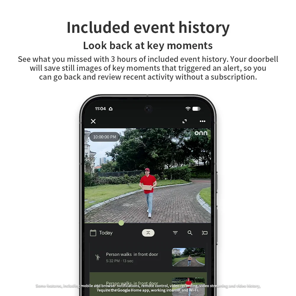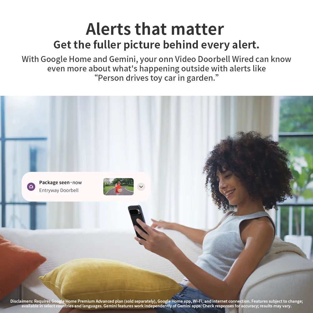 Intelligent home security, built with Google Home and Gemini. Search your video history, get detailed event descriptions and more with a Google Home Premium subscription. Know who’s at your door and know exactly what happened. The onn Video Doorbell Wired provides a complete head-to-toe view, 1200p HDR video, Intelligent Person & Motion Alerts, and 3 hours of included event history, all with seamless control via the Google Home app at an affordable price. Google Home Premium with Gemini makes your smart home smarter, safer, and more effortless.¹ ² It unlocks more home security features for the onn Video Doorbell Wired, with detailed alerts and easier ways to search your video history. And with one epic subscription, your smart home is what it’s meant to be.